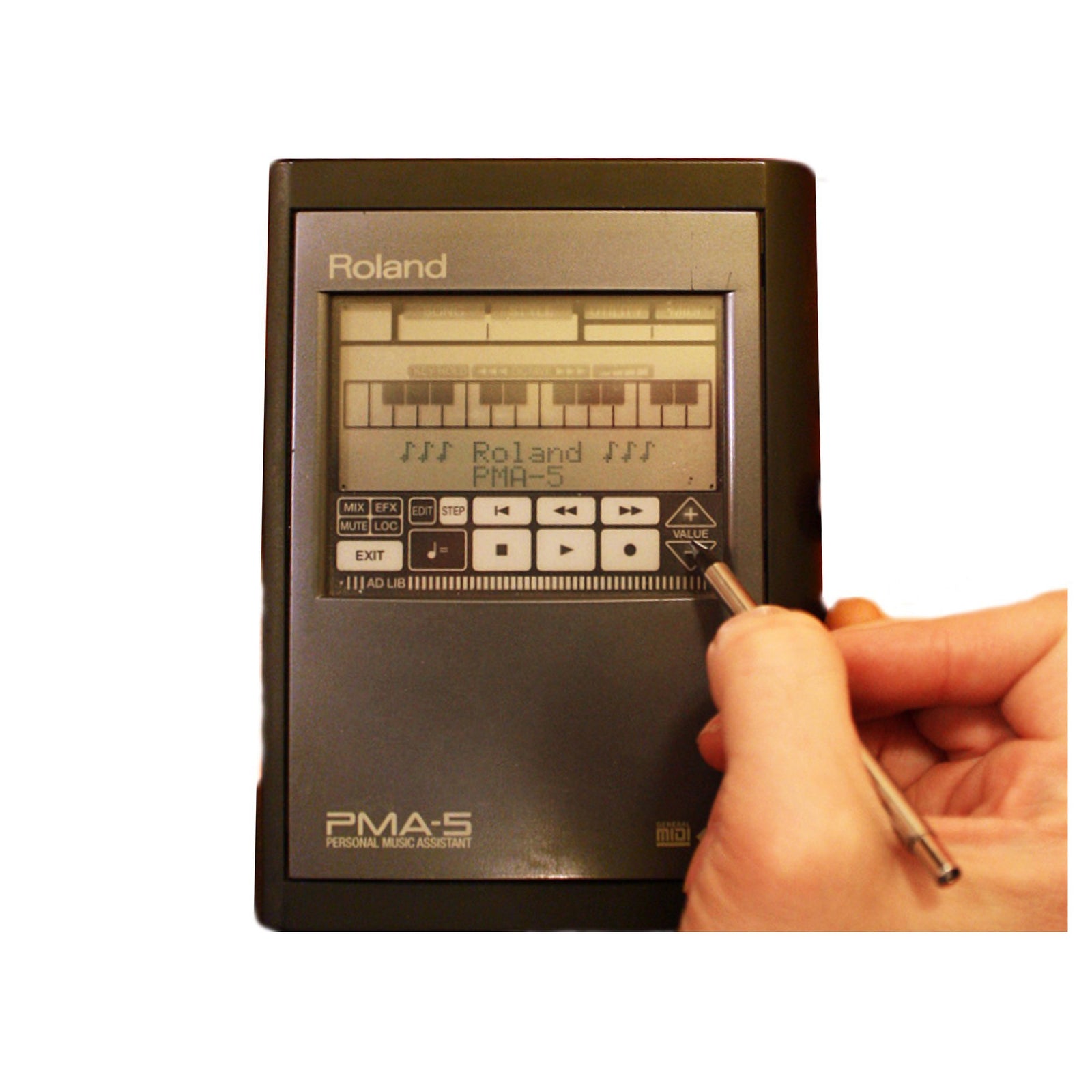 Main connections -- MIDI In and Out, a mini-jack Stereo Line Out/headphone socket, and a 9V power-supply socket -- are located along the top edge of the unit. No power supply is provided, but you do get six AA batteries, with a life of about five hours. There's a socket for a start/stop footswitch, also on a mini-jack, on the side, where you'd expect the edges of the pages to be if the PMA5 really was a Filofax. As a piece of design, it's cute, clever, and covetable.